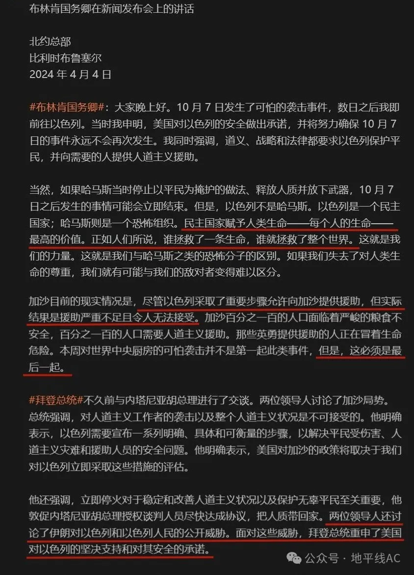 當然,美國並不是一個整體,美國內部有普通的正常人也大多反對繼續支持以色列。但美國政府在民意和猶太財閥之間選擇了後者。美國國務院把這篇發言翻譯成各種文字全世界分發,這代表了美國作為一個國家的基本立場。