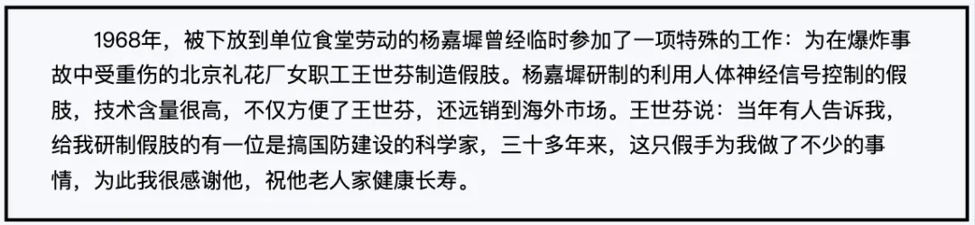 楊嘉墀得知此事,利用自己所學知識,製作了一個由人體神經信號控制的假肢,技術含量很高。