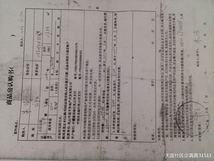 14年前,夫人於2010年6月5日,向乳山市益天房地產開發有限公司(以下簡稱益天公司)預繳房款5000.00元(收款收據編號0007594),訂購一套房湖畔人家79-106號商品房(當時益天公司已將此房標為已售,在夫人對現房不中意時,導購介紹了此房,並説房開公司都是這樣做的),夫人簽訂《商品房認購書》。2010年6月10日,夫人在甘肅省慶陽市益天公司售樓處(有工商營業執照),簽訂了按照貸款利率5.36%×85%=4.556%的貸款合同和購房合同後,夫人向益天公司交納136240.00元(收款收據編號0024690),合計繳清原房價按揭30%部份141240.00元,因甘肅省慶陽市益天公司售樓處無合同章,購房、貸款合同需要到乳山市總公司蓋章,所以夫人無保留合同。