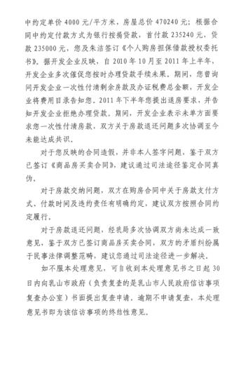 11年後,本人在國家信訪局網頁以索要合同為目的信訪後,乳山市住房和城鄉建設局受理了信訪,本人上百次向其索要合同,2021年11月18日,終於收到乳山市住房和城鄉建設局《信訪事件處理意見書》,信訪事件處理意見書:“經調查,2010年6月5日至9月27日,您先後多次到湖畔人家小區考察購房,9月27日我夫人與開發企業簽訂《商品房買賣合同》,您購房時,該小區為現房銷售,雙方在合同中約定單價4000元/平方米,房屋總價470240.00元;根據合同中約定付款方式為銀行按揭貸款,首付款235240.元,貸款235000元,您及我夫人簽訂《個人購房擔保借款授權委託書》,據開發企業反映,自2010年10月至2011年上半年,開發企業多次摧促您辦理貸款手續未果”並建議:“當事人鑑定真偽、通過司法途徑解決,履行合同。”