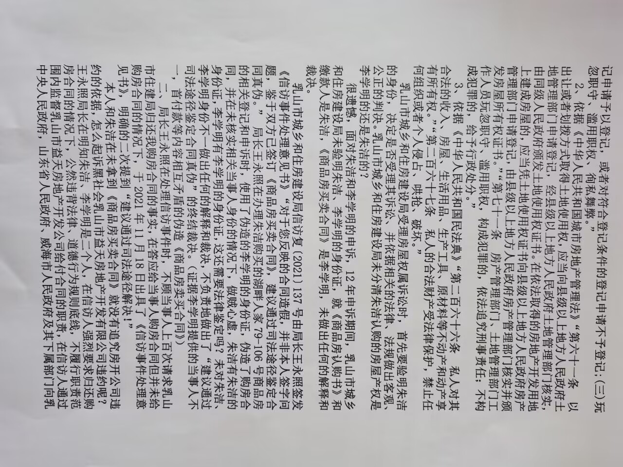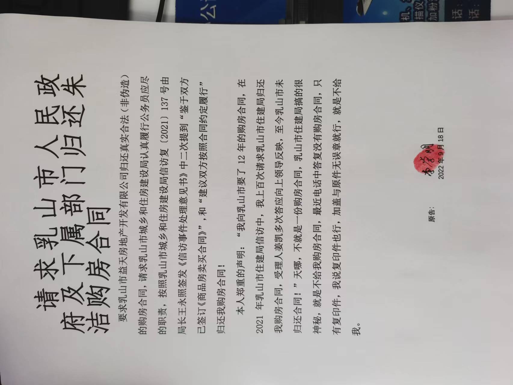 本人只好再申訴要合同:我們向乳山市益天房地產開發有限公司索要購房合同,房地產開發公司明確答覆沒有的,我們向乳山市人民政府反映房地產開發公司收了房款不給購房合同的欺詐行為,乳山市房管部門説有合同!經我們向中央人民政府和省人民政府反映情況,索要合同!乳山市房管理部門寄來了偽造的合同!我們向各級人民政府反映乳山市益天房地產開發公司的欺詐行為,最終乳山市城鄉和住房建設局信訪復〔2021〕137號由局長王永照簽發《信訪事件處理意見書》“對於您反映的合同造假,並非本人簽字問題,鑑於雙方已簽訂《商品房買賣合同》,建議通過司法途徑鑑定合同真偽。”二次提到“鑑於雙方已簽訂《商品房賣買合同》”,“建議雙方按照合同約定履行”。 在2021年此次《信訪事件處理意見書》的信訪事件中,我上百次請求乳山市住建局歸還我購房合同,受理人姜凱多次答應向上級領導反映,在未給我們合同的情況下,乳山市城鄉和住房建設局作出信訪復〔2021〕137號由局長王永照簽發《信訪事件處理意見書》。我們夫妻未拿到購房合同,怎麼去鑑定真偽、怎麼通過司法途徑解決,怎麼履行合同?最近,在我們向威海市人民政府反映的答覆中:經落實,乳山市回覆如下: 關於購房合同問題,經溝通,開發企業表示購房時已提供給您合同原件,若您需要合同複印件應向開發企業索要,政府部門無職責向您提供合同資料,經協調,開發企業表示需您與企業雙方對接溝通有關提供合同複印件問題。《商品房認購書》不需向住建部門監管備案,簽名行為是購房人自願行為,商品房買賣以《商品房買賣合同》簽字為準。住建局已多次與您溝通解釋相關問題,並未存在撒謊欺騙您的行為。”在我們上百次向乳山市益天房地產開發有限公司索要合同的過程中,對方明確的答覆:合同已經給你們了,我們沒有合同!但乳山市人民政府始終説有購房合同,卻沒有給我們真合同,給個假合同複印件,我們請加蓋章公章(房開公司或者主管部門),並寫上與原件無誤,乳山市住建局堅決予以拒絕!