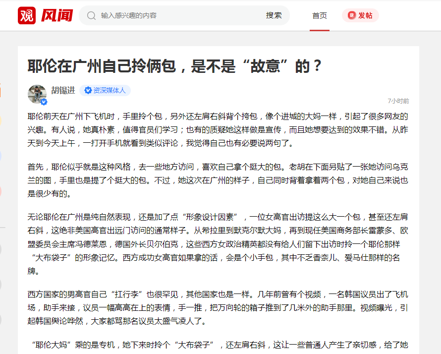 這幾天,美國財長耶倫老太太跨越重洋,不遠萬里第二次來到中國,引起全球包括中國人的廣泛關注。然而,一些中國人卻把注意力放在了耶倫自己背的小包上,讚譽這是親民形象,而忽略了老太太乘坐的是一架豪華的美國專機。特別是當我看到一些網友的評論,心中就抑制不住的想大笑!我並不想對這些評論進行過多的評價,而是引用網友“佛道本一家”的一段精彩言論,來揭示一些人對這一事件的誤解,並請大家看看明白人是如何看這件事的:“耶倫的行為特別符合西方新聞學的理論——狗咬人無所謂,人咬狗才是新聞。一個美國政府高管,坐美國政府的專機,飛到幾萬公里以外的國家,然後裝模作樣地背兩個大包下舷梯。這事兒就像狗咬人一樣,絕對反常。所以那些大大小小的新媒體,自媒體瘋了一樣報道這個反常。”