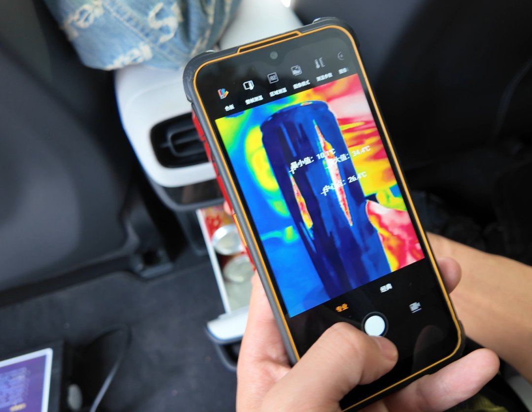 我們同時將 22 ℃的可樂,塞滿兩車冰箱,冰箱温度均調到最低,一個小時後測温,小米 SU7 裏的可樂降到 10 ℃左右,比問界要低 2 ℃。
