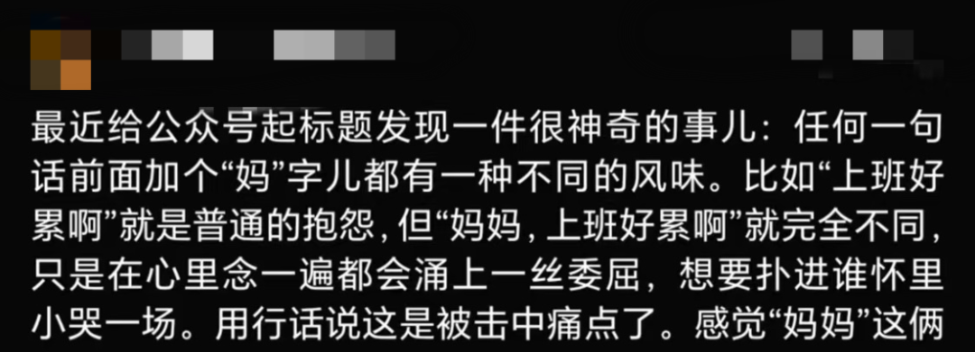 任何一句話前面加上“媽媽”,都會有不同的味道。比如“上班好累啊”變成“媽媽,上班好累啊”,就從一種單純的抱怨升級為無可名狀的委屈。
