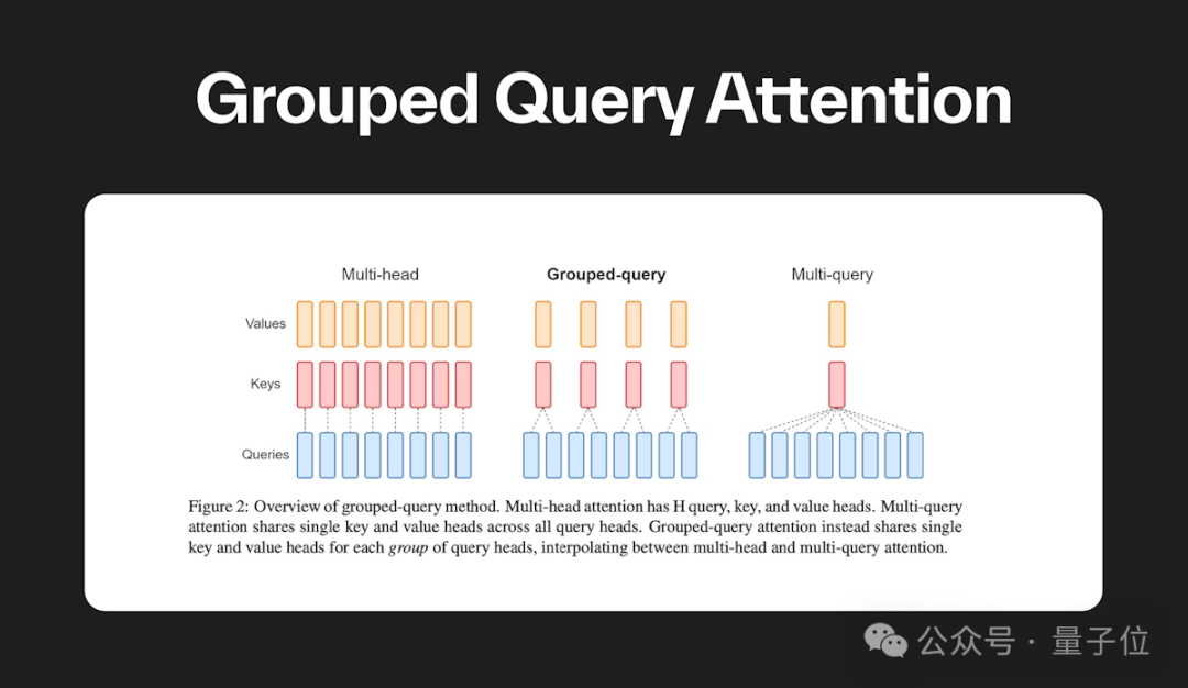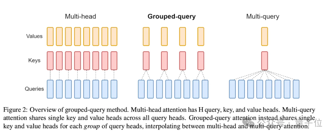 GQA 通過將查詢頭分為組,每個組共享單個鍵頭和值頭,來實現這一點,從而在質量和速度之間取得平衡。