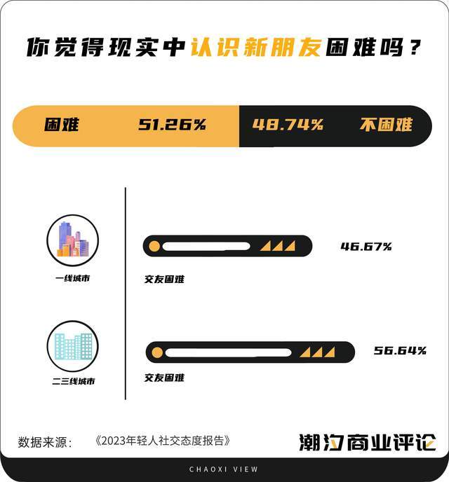 快節奏的生活,讓社交半徑被壓縮的年輕人對於社交充滿需求。據Just So Soul研究院發佈的《2023年輕⼈社交態度報告》數據顯示,過半(51.26%)年輕人覺得現實中認識新朋友困難,而相比文化娛樂更為豐富的一線城市,身處三四線城市中的年輕人這種感受更加強烈。