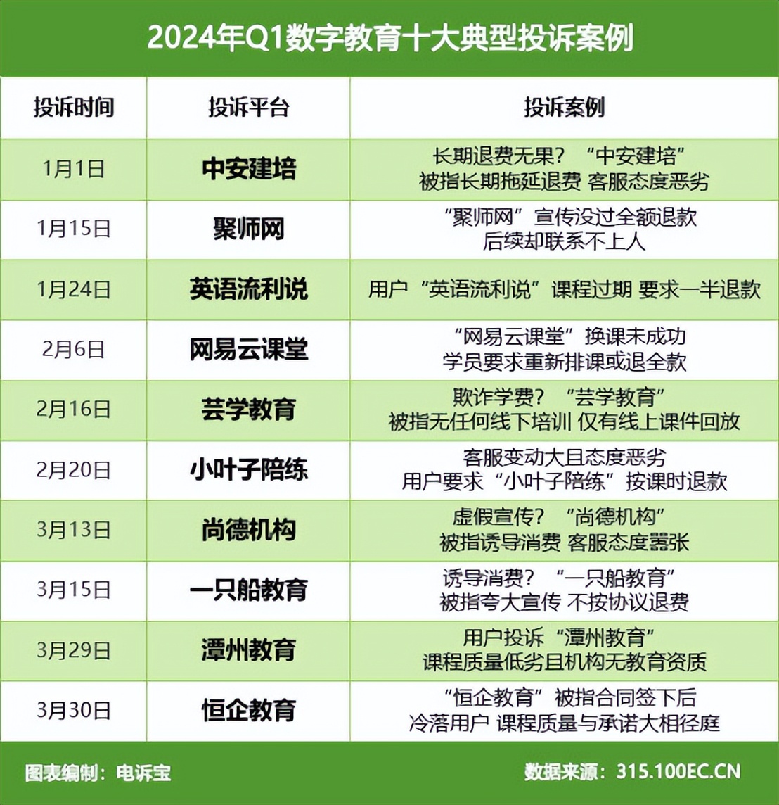 此外,入選《2024年Q1數字教育典型投訴案例》的有:中安建培、聚師網、英語流利説、網易雲課堂、芸學教育、小葉子陪練、尚德機構、一隻船教育、潭州教育、恆企教育。