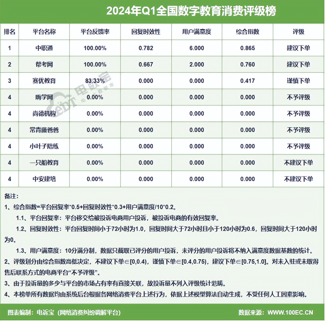 在2024年Q1全國數字教育評級榜中:獲**“建議下單”評級的有:中職通、幫考網等2家;獲“謹慎下單”評級的有:賽優教育等1家;獲“不建議下單”評級的有:一隻船教育、中安建培等2家;獲“不予評級”**的有:尚德機構、常青藤爸爸、小葉子陪練等3家。