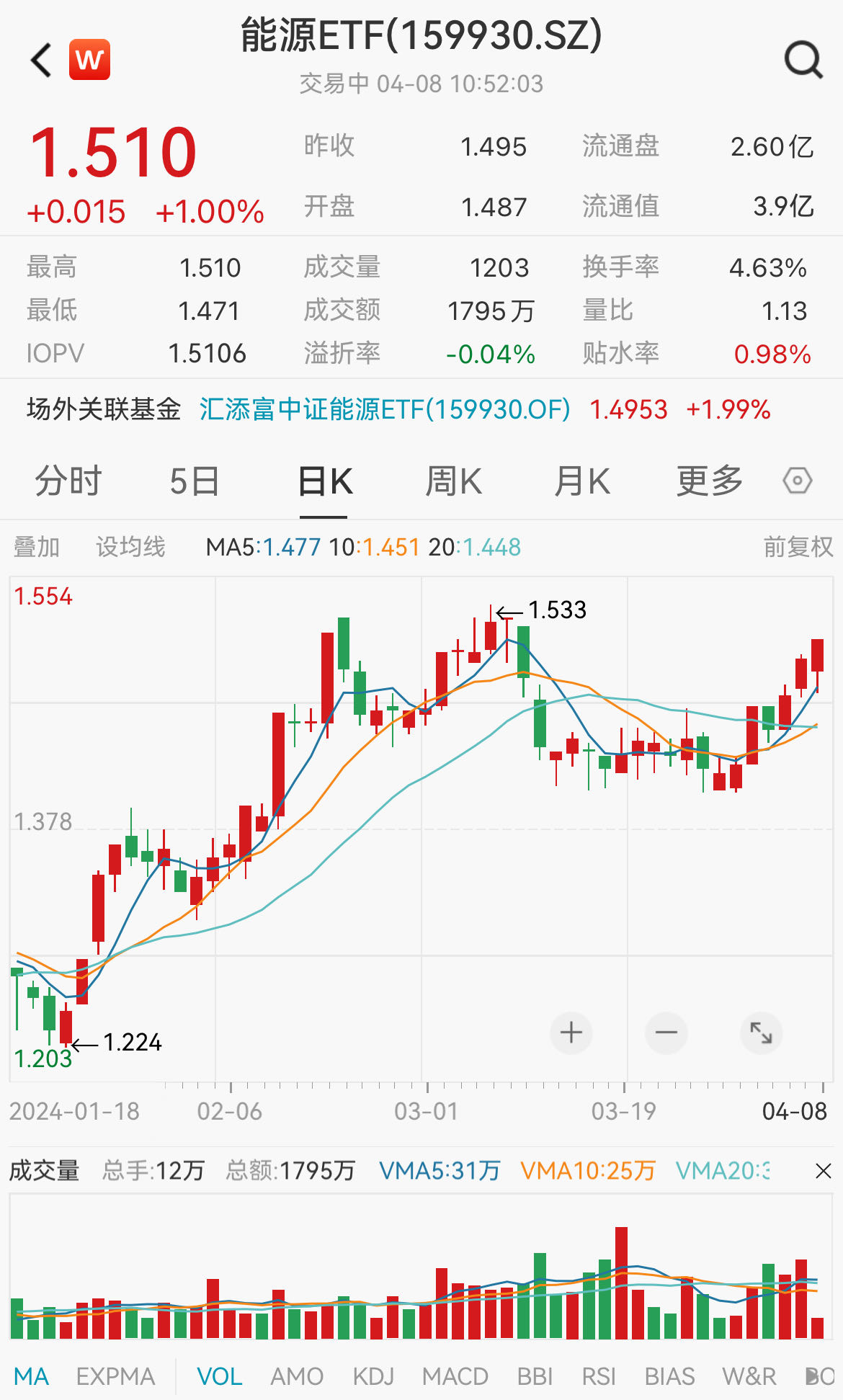 截至2024年4月8日 10:52,中證能源指數(000928)強勢上漲1.02%,成分股山西焦煤(000983)上漲2.21%,中國石油(601857)一度漲超2%,平煤股份(601666)上漲1.61%,山煤國際(600546),永泰能源(600157)等個股跟漲。能源ETF(159930)上漲1.00%,衝擊3連漲。最新價報1.51元,盤中成交額已達1794.73萬元,換手率4.63%。
