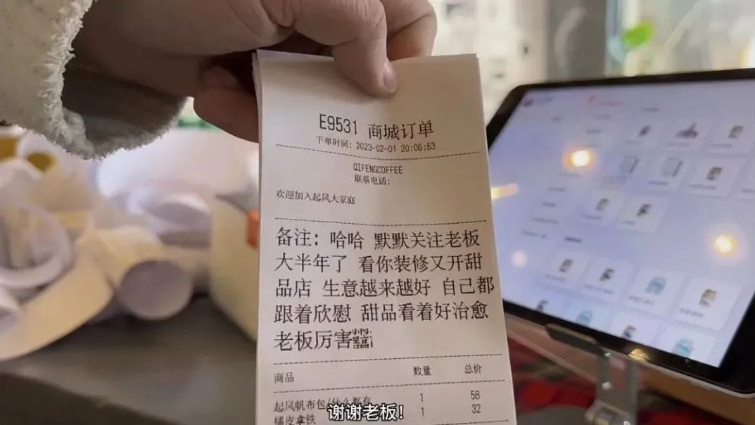 李照林換上一卷新的打印紙,“讓它盡情吐一會。”小票一張接一張地往外冒,很快堆滿了整個吧枱,出單機又響起“滴、滴、滴”,李照林熟練地補上一卷。用完了,又補上一卷。接着,他對着自己的鏡頭展示那些小票上的留言: