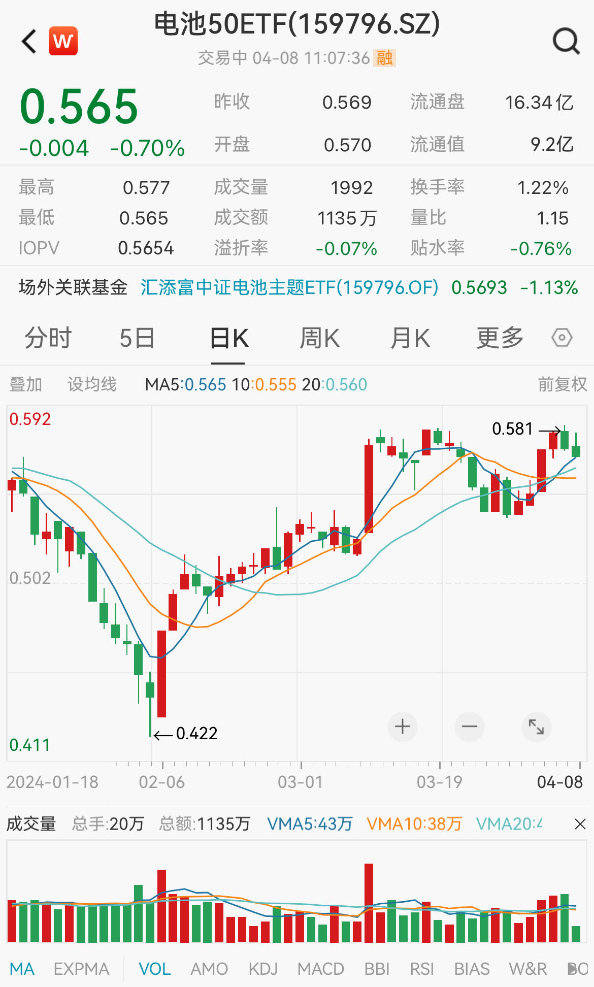 截至2024年4月8日 11:07,電池50ETF(159796)下跌0.70%,最新報價0.57元,盤中成交額已達1135.39萬元,換手率1.22%。跟蹤指數成分股方面漲跌互現,勝華新材(603026)領漲4.71%,當升科技(300073)上漲4.04%,南都電源(300068)上漲3.32%;固德威(688390)領跌5.24%,珠海冠宇(688772)下跌3.94%,昱能科技(688348)下跌3.45%。