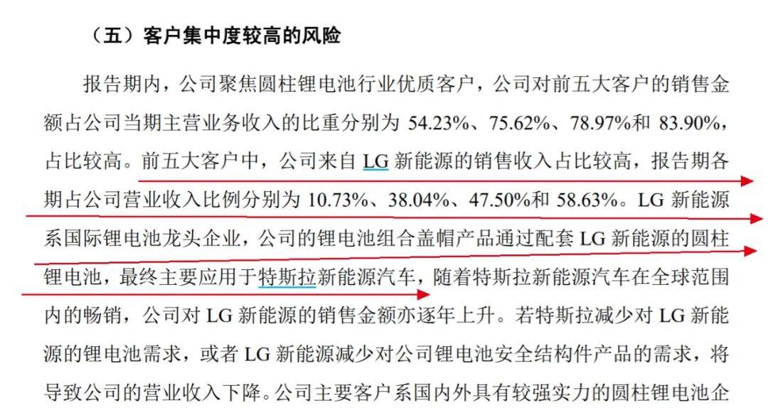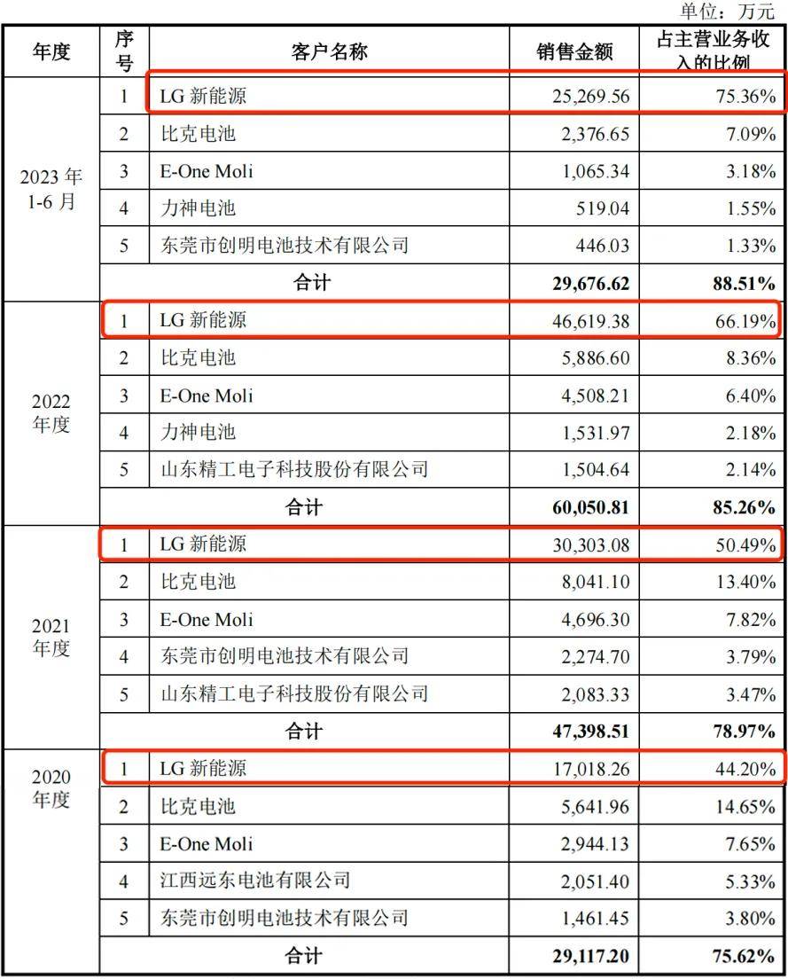 **而長期佔據公司第一大客户位置的正是LG新能源。**報告期內,公司向LG新能源的銷售金額分別為1.70億元、3.03億元、4.66億元和2.53億元,佔當期主營業務收入的比例分別為44.20%、50.49%、66.19%和75.36%,逐步增長。