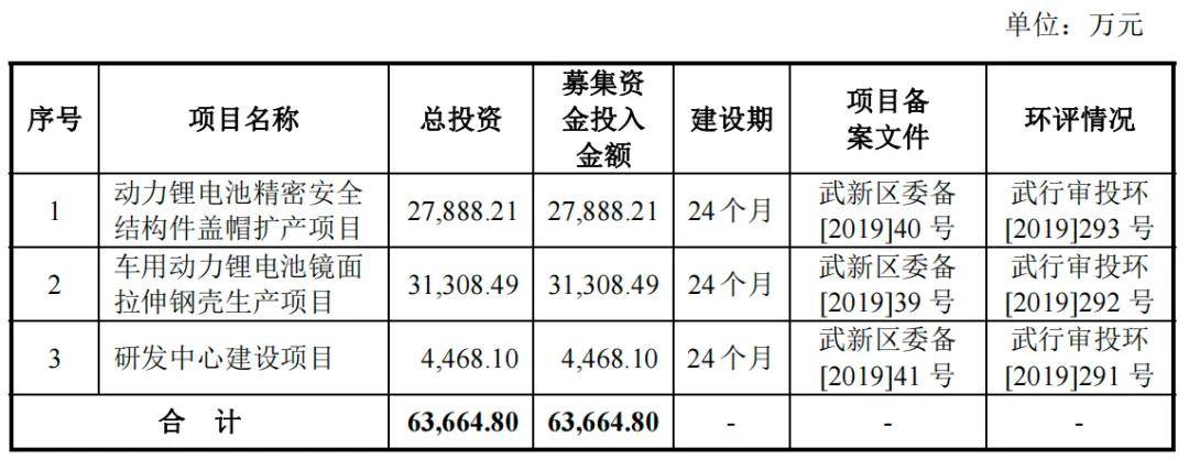實際上,這並不是中瑞股份第一次衝刺創業板。早在2019年6月,中瑞股份便遞交了招股説明書,申報在創業板上市。彼時,公司擬募集資金6.37億元,主要用於動力鋰電池精密安全結構件蓋帽擴產、車用動力鋰電池鏡面拉伸鋼殼生產以及研發中心建設項目。