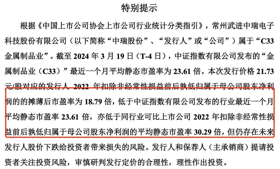 中瑞股份本次發行價格21.73元/股,對應的公司2022年扣除非經常性損益前後孰低歸母淨利潤的攤薄後市盈率為18.79倍,低於中證指數發佈的行業最近一個月平均靜態市盈率23.61倍,亦低於同行業可比上市公司2022年扣除非經常性損益前後孰低歸母淨利潤的平均靜態市盈率30.29倍。