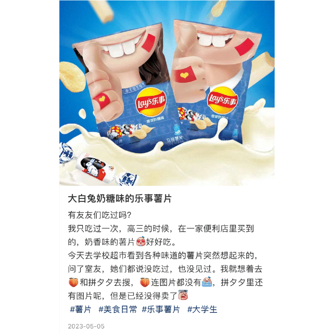 事實上,認可樂事薯片的中國年輕人仍不少見。小紅書上的年輕人也會更YouTube上的歐美博主一樣,分享自己從海外代購來的樂事薯片分享試吃心得,甚至把吃完的薯片袋子當成拍照的道具。