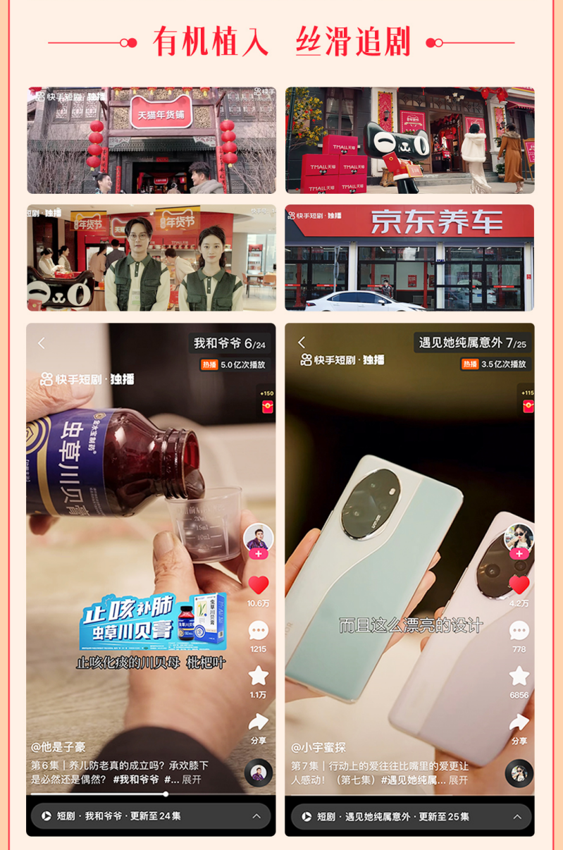 仍以寒假檔為例,快手短劇的多重組合拳,可以説實現了短劇商業價值的最大化。**一方面,作為國內最早佈局短劇賽道和開啓檔期化運營的平台,以及持續穩定的爆款內容輸出,讓快手短劇在用户和品牌心中形成了一定的廠牌影響力。**檔期化運營的特質也讓其能夠高度貼合品牌的營銷節點,精準出擊。