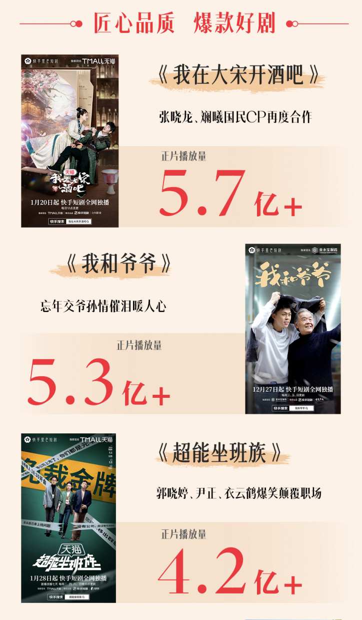《我在大宋開酒吧》《鴛鴦斷》《超能坐班族》是快手短劇與天貓合作的天貓品牌劇,瞄準的正是春節這個電商年貨節的關鍵節點,而三部劇累計13.7億的站內播放量也有效助力品牌在檔期內的高效曝光。