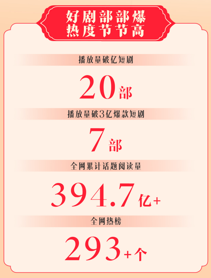 剛剛過去的寒假檔,快手短劇同樣跑出了一條熱度與口碑兼具、題材多元化與商業價值共贏的路線:數據顯示,**快手短劇寒假檔播放量破億短劇達到20部,其中播放量破3億的短劇達7部,全網累計話題閲讀量達到394億。**品牌營銷的價值也在這一時期被深度挖掘。