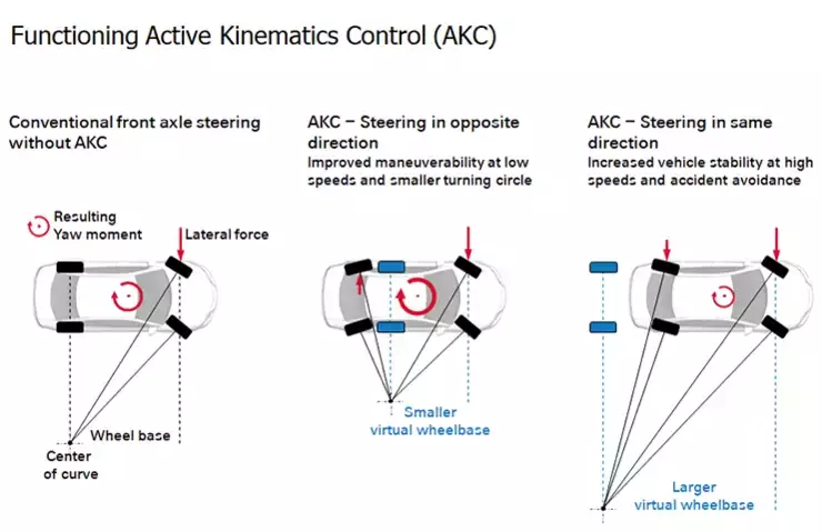 簡單説就是,低速狀態下,後輪和前輪反向打方向,減小轉彎半徑,方便過彎;高速狀態下,後輪和前輪就同向打方向,可以做到斜着滑行,車身更穩定。
