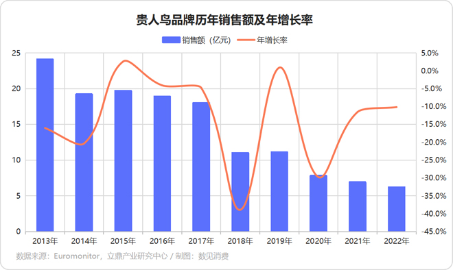 從2017年開始,貴人鳥品牌自身收入開始出現階梯式下滑,且一發不可收拾,到了2022年,銷售額縮水到僅剩2013年的26%。
