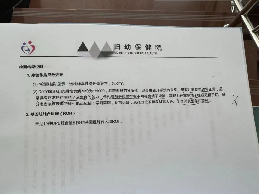 因此,扶風才做了羊水穿刺,孩子染色體異常,多了一條Y染色體。當地醫院從未遇到過XYY染色體的情況,無法給出有效建議,扶風只能去跑到省醫院諮詢。