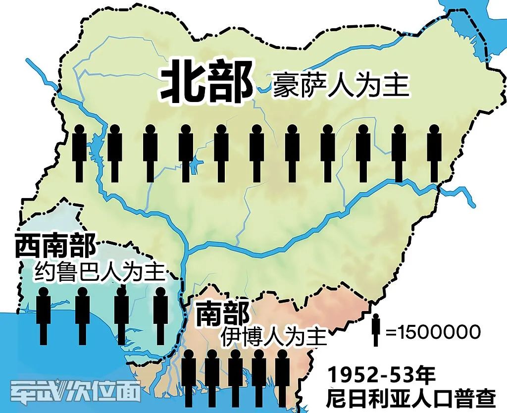 ▲尼日利亞被英國人劃分為三個聯邦州(1952-53年人口分佈圖)