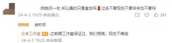 當時粉絲提問仝卓與室友(劉昱晗)的關係,工作室的“現在不確定”變相實錘了。