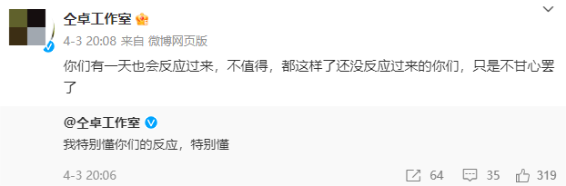 仝卓白眼狼加上仝卓媽媽的造謠,才導致工作室相關人員出來開撕。