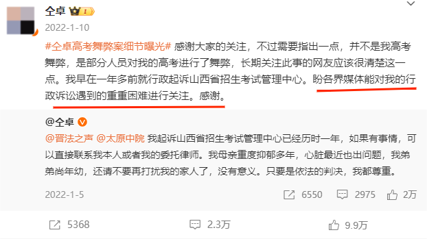 2022年1月10日,仝卓高考舞弊案細節曝光。