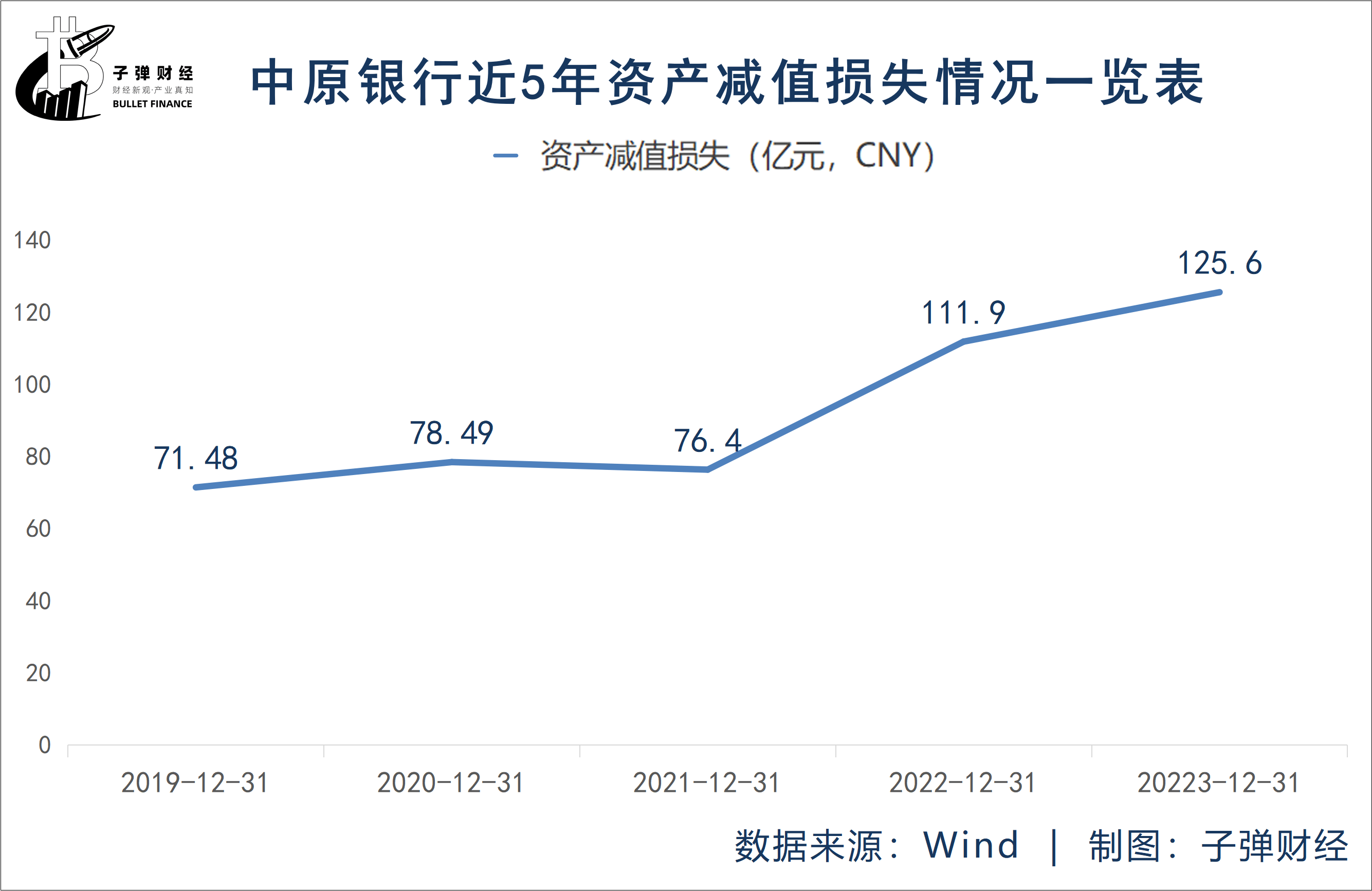 年報顯示,2023年中原銀行資產減值損失為125.6億元,同比增加13.7億元,增幅12.2%。而在2022年中原銀行資產減值損失為111.9億元,較上一年的76.4億元同比增長46.5%。