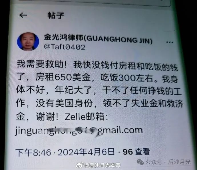 4月6日,金大律師在X(推特)發文稱自己已經快要沒錢付房租和飯錢了……需要救助。