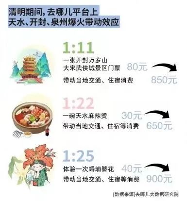 這些數據充分説明了旅遊活動對低線城市的巨大貢獻。據去哪兒大數據研究院的估算:一頓30元的天水麻辣燙不僅限於餐飲本身,還能帶動當地交通、住宿等消費額增加至650元;前往開封萬歲山武俠城景區的門票80元,可促進當地交通、住宿消費達850元;而泉州簪花體驗活動只需40元,卻能帶動當地交通、住宿消費高達900元。