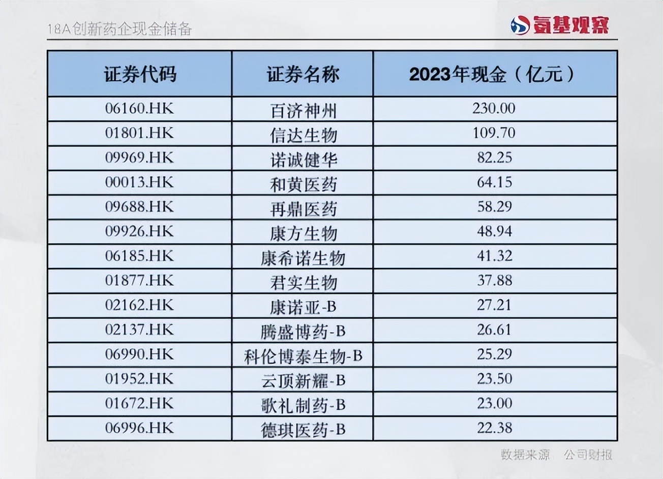 目前,上市的創新藥企的現金儲備狀況如何呢?我們可以從港股18A創新藥企的數據中得到一些啓示。