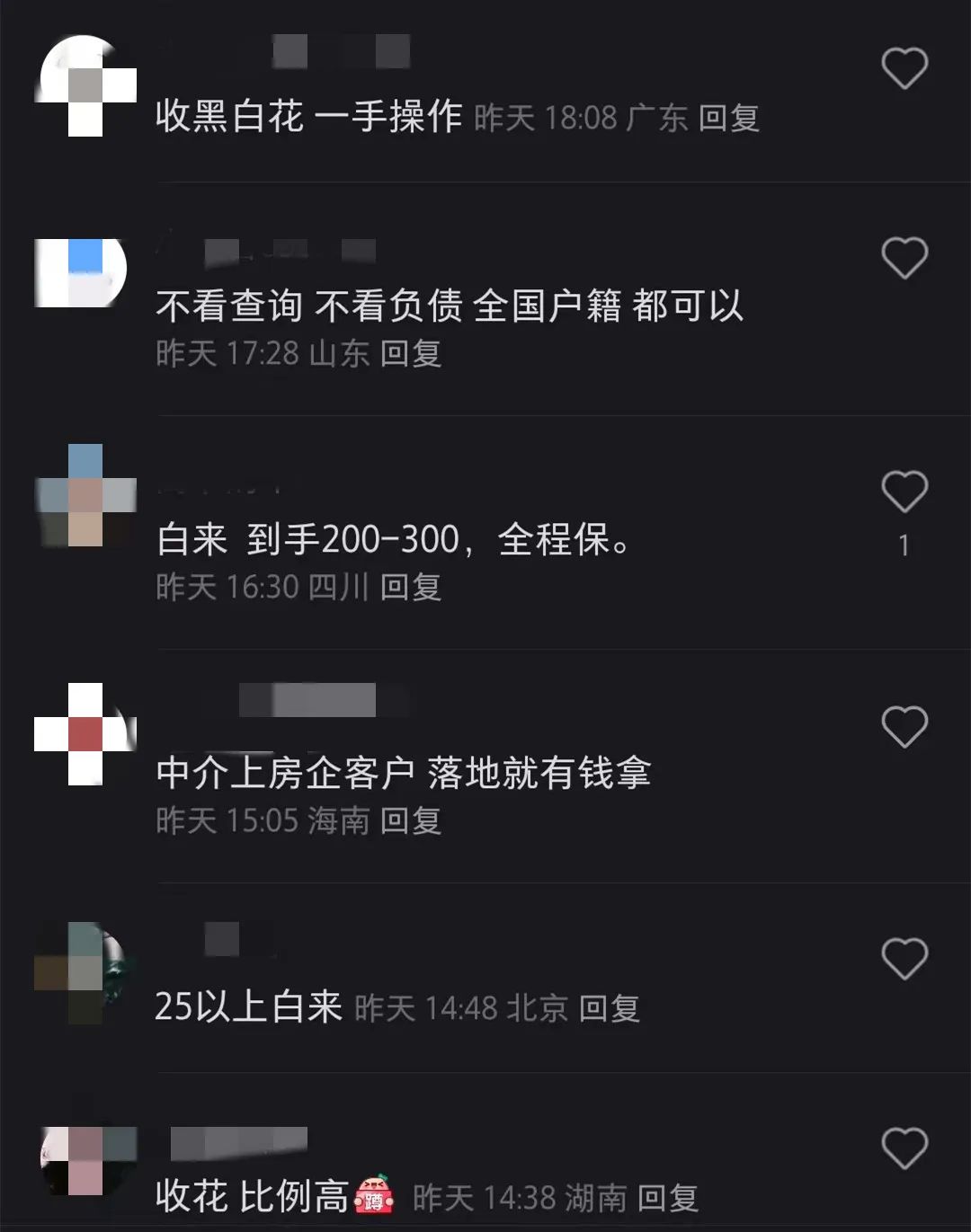 在小紅書、抖音、微博等各路社交媒體上,你總能刷到一些關於“快速致富”的文章,評論區內都充斥着**“收花户”、“白户可做”、“三個月下款”、“一手大量村民”、“到手300”**等黑話。