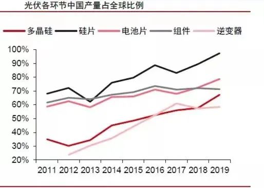 2011-2019年光伏各環節中國產量佔全球比例變化