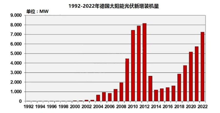 1992-2022年德國太陽能光伏新增裝機量