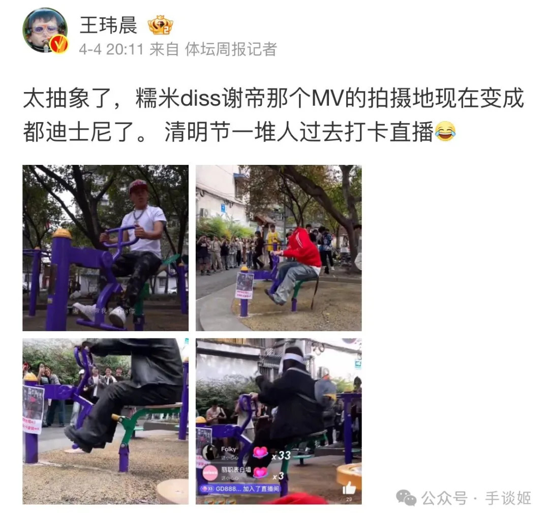 據説這首《謝天謝帝DISS》的mv在一些平台很火,“diss你”被聽成了“迪士尼”,諾米在mv中在健身器材上擺pose的場景,也導致該小區的健身器材被冠以“成都迪士尼”的稱號。