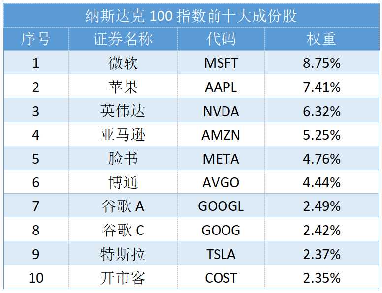 在人工智能的時代浪潮之下,在AI領域有着領先佈局和深厚積澱的科技巨頭集中在納斯達克100指數,前十大權重佔比達46.56%,龍頭屬性集中。