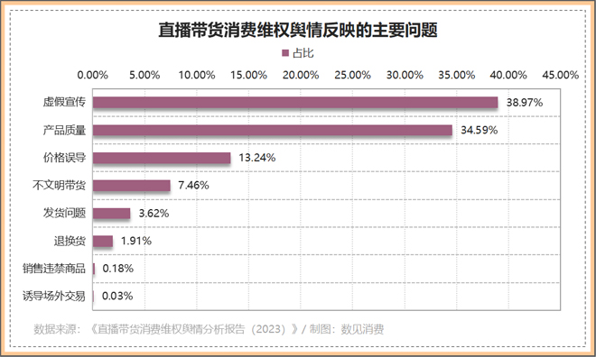 而這些維權反饋中,關於”虛假宣傳“的佔比38.97%,比重最大;其次是”產品質量“問題,佔比34.59%;與主播相關性最大的”不文明帶貨“問題,投訴佔比7.46%。比如,此前某頭部主播的徒弟因低俗直播帶貨某大牌化妝品引起消費者不適,被平台禁播的事件在網上發酵許久。