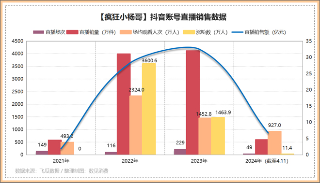 【瘋狂小楊哥】數據也同樣不樂觀。在宣佈“隱退”的2024年,漲粉速度幾乎按下了暫停鍵。今年2月小楊哥僅帶貨直播1場,4月到目前還未進行過直播。