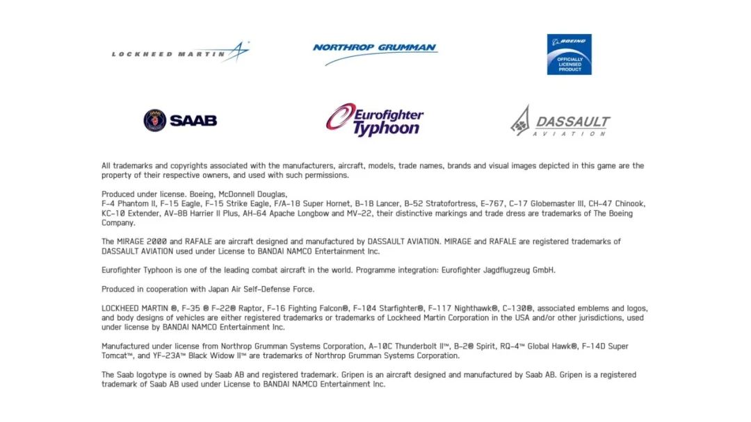 對於中國軍迷來説,《皇牌空戰7》仍然有一個遺憾,這倒不是遊戲官方故意搞區別對待,而是為了避免侵權造成法律問題。事實上,《皇牌空戰7》中的大部分所有飛機都受到了原廠授權,例如洛克希德·馬丁、達索、薩博等等。
