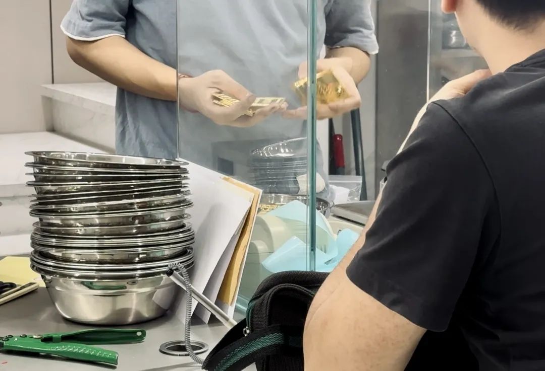 在回收櫃枱,工作人員將收來的黃金分別裝進一個個鐵碗裏,再排列到貨架上等待鑑定,不知道的人乍一看,可能會以為是某個正在備餐的餐廳後廚。