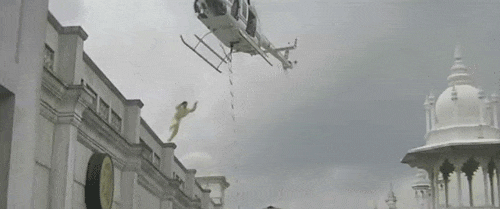 另一鏡頭,成龍需要從天台用力一跳,去抓住直升機軟梯。