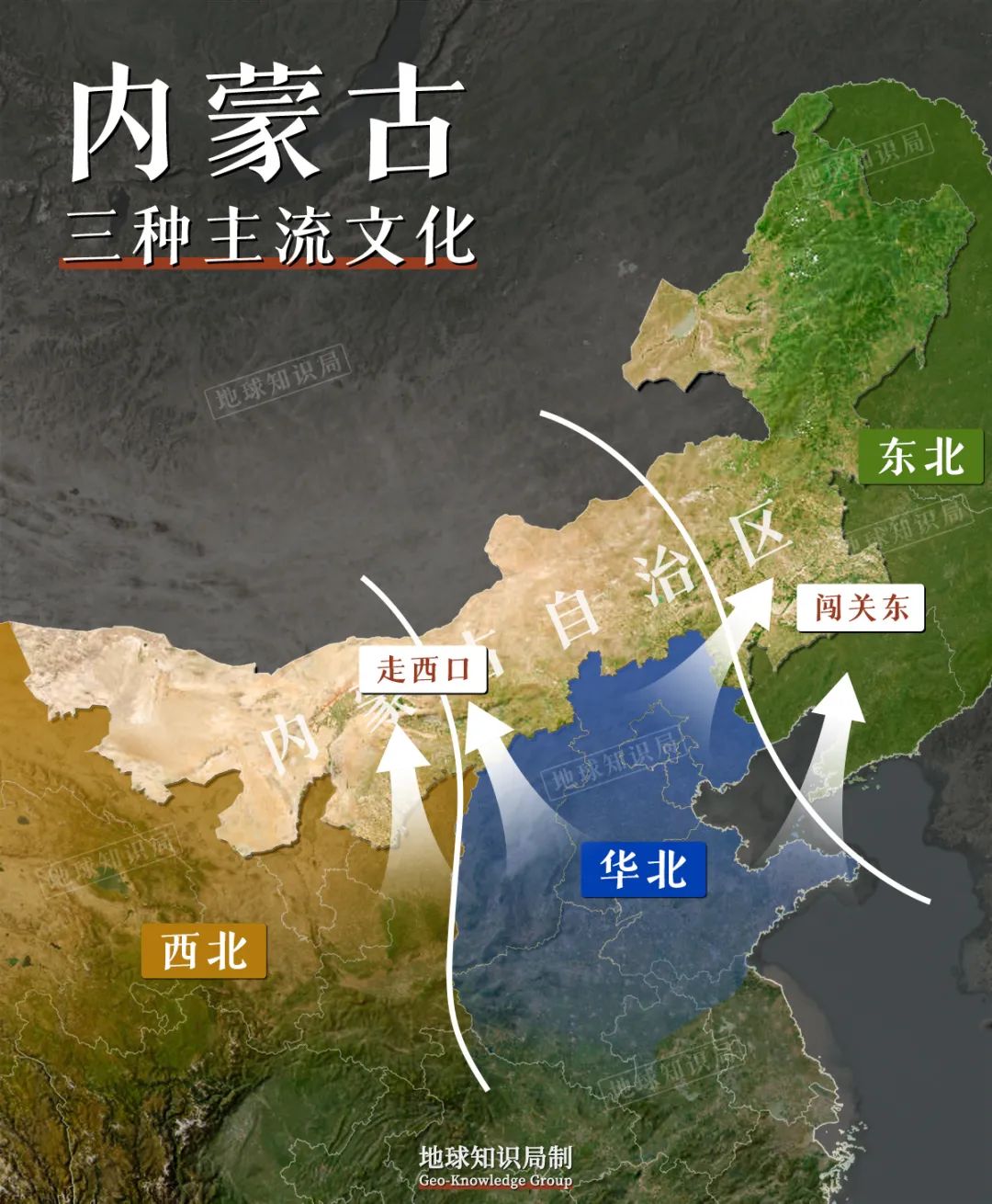 再加上內蒙古這種**“粗扁狀”的版圖**,相當於加大加粗版的甘肅。一個內蒙古,東有“闖關東”,西有“走西口”,“三花聚頂”了三種主流文化,東北、華北、西北——“我全都要”!