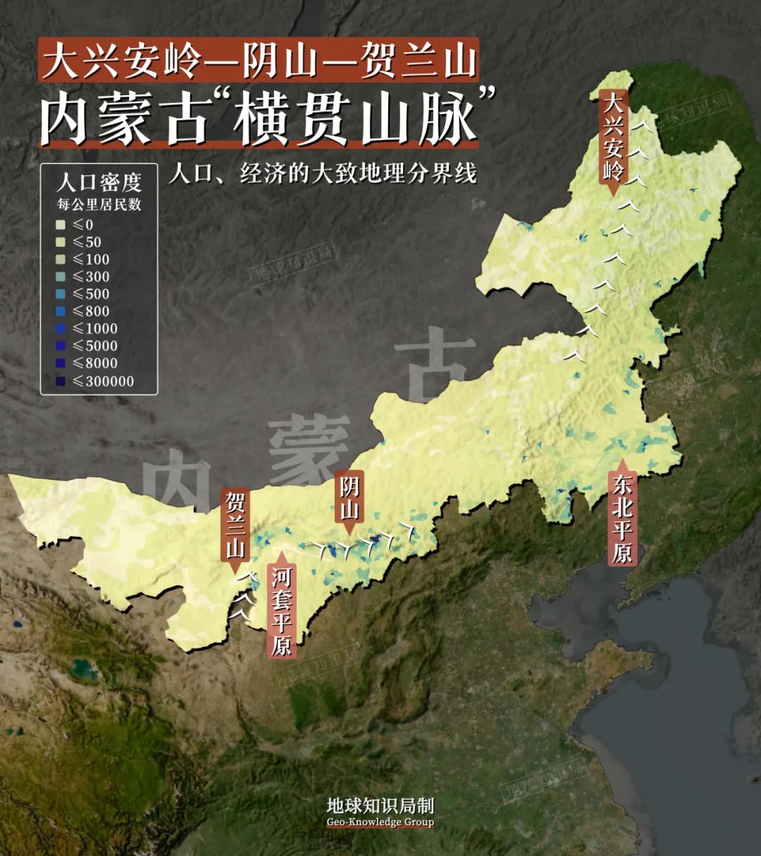 內蒙古大部分人口和經濟都集中在“大興安嶺——陰山——賀蘭山”前面的平原地帶。這條巨長的連體山脈,相當於內蒙古的“橫貫山脈”。