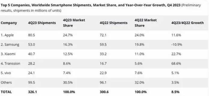 相反,在這份報告中,除了三星微降,小米和傳音都取得了大幅增長,小米出貨量同比增加33.8%,市場份額從11.4%,上升到了14.1%。