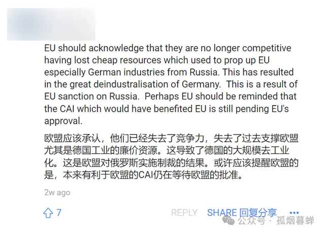 “歐盟還是認了吧,真正的問題在於,歐盟現在已經失去產業競爭力了。沒有了廉價資源作為支撐的歐盟工業,尤其是德國工業,經歷大規模去工業化是早晚的問題。這就是歐盟強推對俄製裁的結果。”