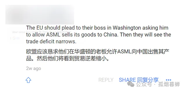 “我覺得歐盟與其來PUA中國,還不如去華盛頓跪求一個試試,懇求他們的美國老闆允許歐盟對華出售阿斯麥的光刻機。光刻機多值錢啊,到時候還擔心中歐貿易逆差降不下來嘛?”