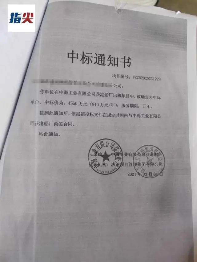 △荻港船廠項目出租的中標通知書(記者 劉強攝)