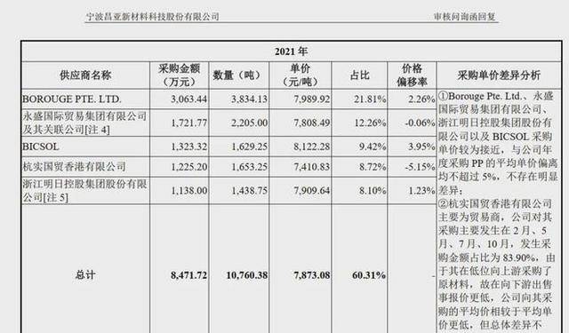 其中,杭實國貿成立於2017年7月11日,2018年與昌亞股份開始合作,2021年成為昌亞股份PP(聚丙烯)原材料的第四大供應商。另一家天捷塑料成立於2021年1月,成立當年即與昌亞股份發生業務合作,彼時雙方交易金額為41.03萬元,2022年合作交易金額進一步上漲至170.77萬元,達到昌亞股份同類採購金額的82.49%。
